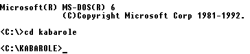 2. Type "CD KABAROLE" and press <Enter> at the DOS prompt (<C:\>). The default directory