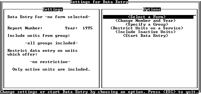 - Start Data Entry: Pressing <Enter> when this option is highlighted will start the process of data