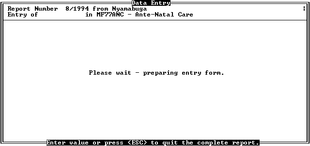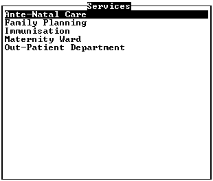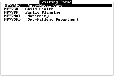 data on ante-natal care services. This data entry form will be chosen when you press the <Enter> key. You can highlight another data entry form by pressing the up / down arrow keys. Your choice will be