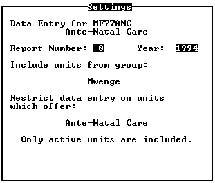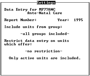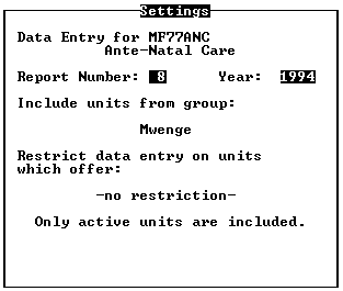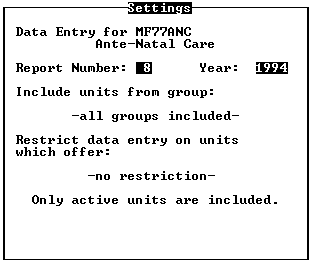Fig. 3.1-3: The "Settings" box after selection of the data entry form "MF77ANC", which is used for entering data on ante-natal care services.