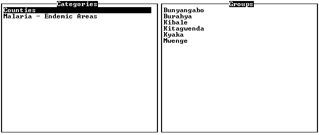 6. Choose "Specify a Group" from the "Options" box. "Kabarole!" will display the "Categories" and "Groups" boxes (compare figure 3.1-5).
