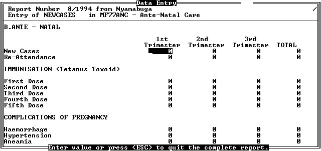 data entry fields now. All the entry fields are filled with zeros. That is because no report number 8/1994 has been entered for Nyamabuga, yet. If a health unit was selected for which a report had been entered