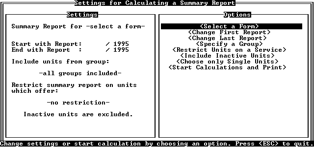 - Start Calculations and Print: Pressing <Enter> when this option is highlighted will start the process of summarizing reports. However, you can only start summary after you have specified a