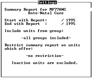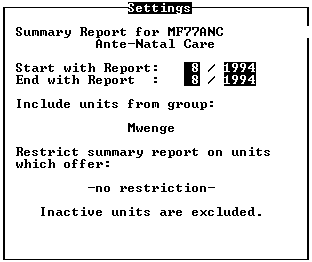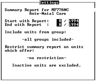generate a summary report for only that month. E.g. entering 8/1994 as first report and as last report will generate the summary report for 8/1994. Figure 4.1-4 depicts the "Settings" box after