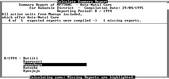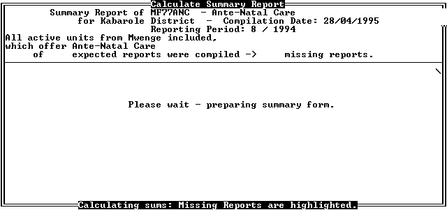 Fig. 4.1-9: The screen "Calculate Summary Report" while "Kabarole!" is loading the report form "MF77ANC - Ante-Natal Care".