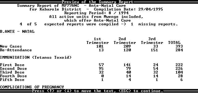 many are missing. If you calculate a summary report for the report form of ante natal care services, you must restrict the included health units to those which offer this service. If you include all health