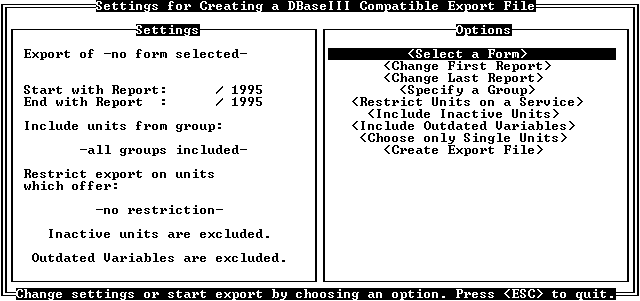 - For further evaluation with external programs, a selection of reports from a specific form has to be exported into a "DBaseIII" compatible export file.