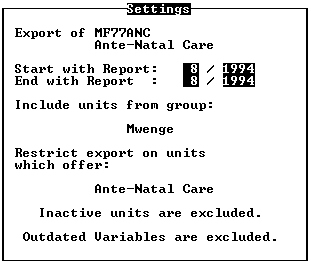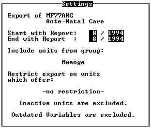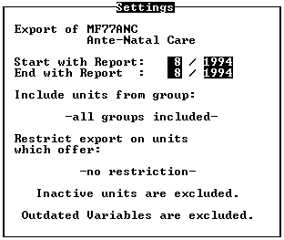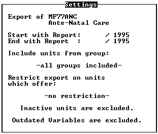selecting single health units (compare figure 4.1-7) or to the screen "Settings for Creating a DBaseIII Compatible Export File" (compare figure 4.1-16).