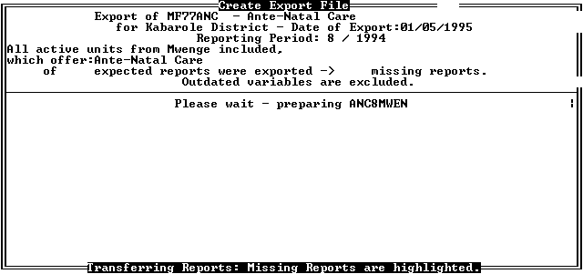 office. One of the report forms is highlighted. In figure 3.1-2 this is "MF77ANC", which is used for ante-natal care services. It will be chosen when you press the <Enter> key. You can highlight