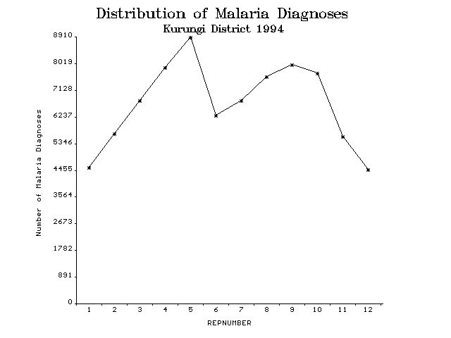 4. Enter the command for the line graph. E.g. enter 'line repnumber /sum=malaria4 /label="Number of Malaria Diagnoses"' at the command prompt. "EpiInfo" will:
