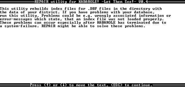 handling data properly, or when you get a terminating system error message, you should run the "Repair" utility. The "Repair" utility is in the "KABAROLE" directory.